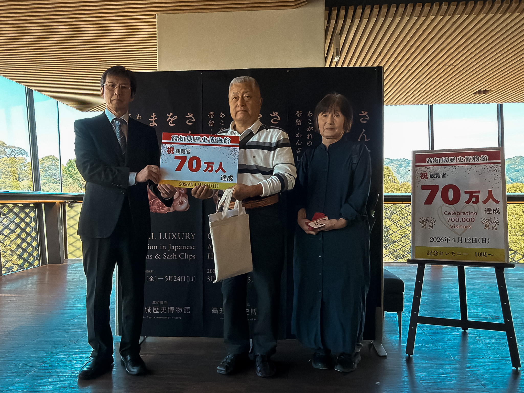 70万人目のお客様に、当館からオリジナルグッズ等を記念品としてお贈りしました。