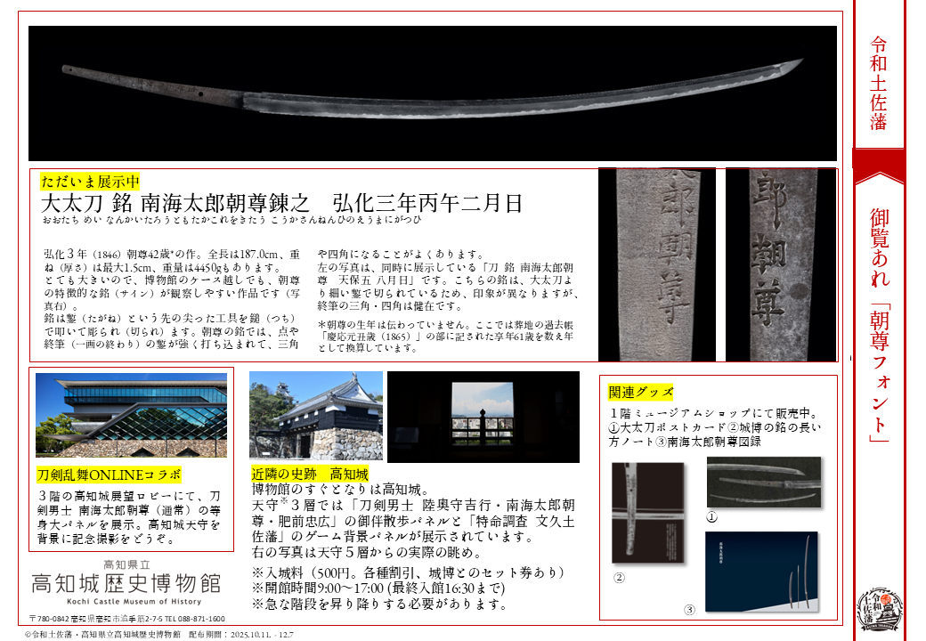 特別展会場(佐川町立青山文庫)に加え、高知県立高知城歴史博物館、高知県立歴史民俗資料館に「刀剣男士 南海太郎朝尊」のパネルを設置予定です。