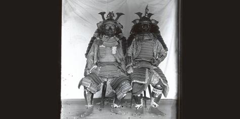 向かって左の人物の具足は、12代土佐藩主山内豊資所用と伝えられるもので、現存している。当館にはこのようなゼラチン乾板のほかコロジオン湿板、アンブロタイプなどのガラス板写真があわせて369枚伝来している。