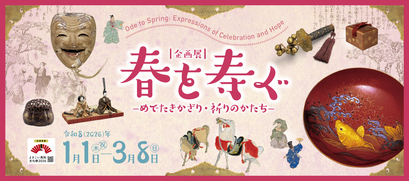 新春を祝うおめでたいデザインの美術品をはじめ、桃の節句に飾る雛人形や雛道具、お花見を描いた浮世絵など春にちなんだ資料を展示します。