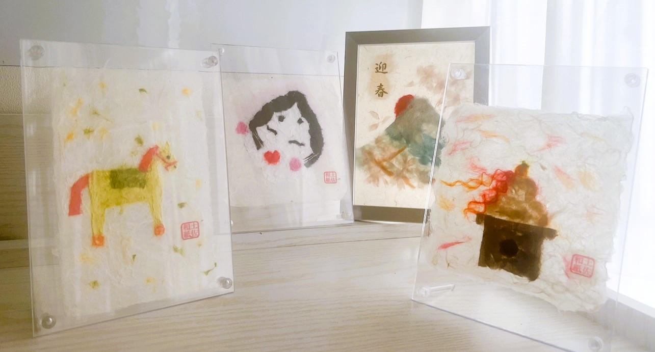 自分だけの「和紙」をつくり、その上に色和紙でお正月にちなんだアート作品をつくります。